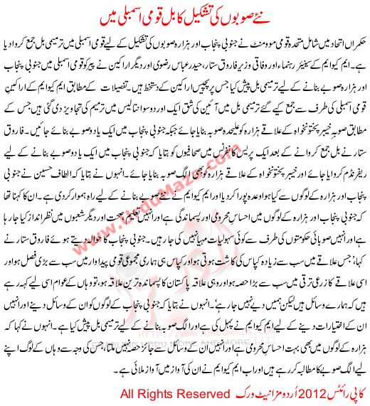 Naye Soobon Ki Tashkeel Ka Bill Qomi Assembly Ma