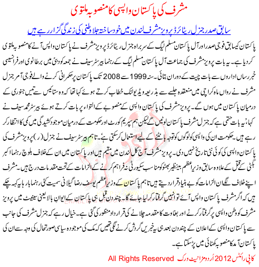 Musharaf Ki Watan Wapsi Ka Mansooba Multvi