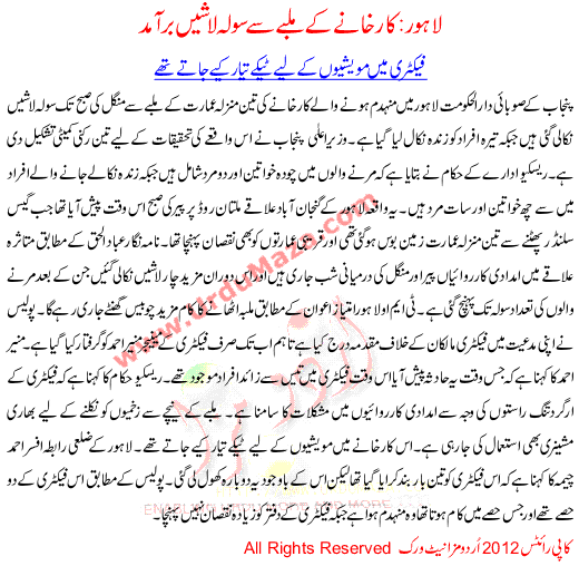 Lahore Karkhany K Malbay Sa 16 Laashain Bramad