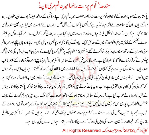Sindh Nationalist Leader Mir Alam Murree Is Missing