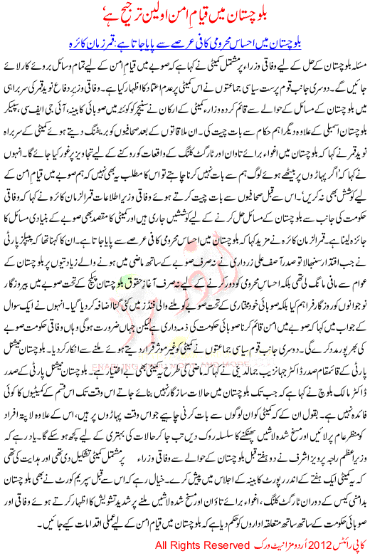 Blochistan Ma Qayam E Aman Awleen Tarjeeh Ha