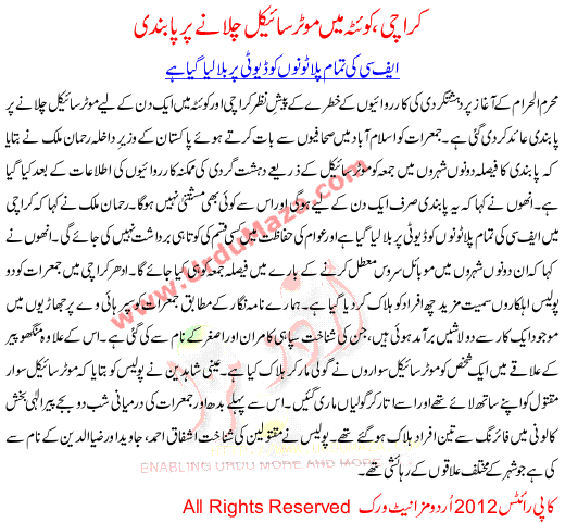 Karachi Or Koita Me Motor Cycle Chalane Per Pabandi