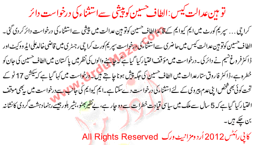Toheene Adalat Case Altaf Hussain Ko Peshi Se Istashna Ki Darkhwast Daire