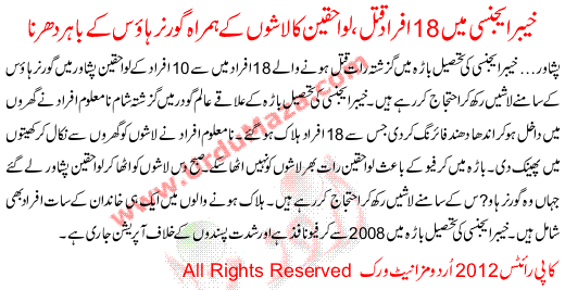 Khaber Ajency Me 18 Afrad Qatal Lawahqeen Ka Lasho K Hamra Governer House K Bahir Dharna