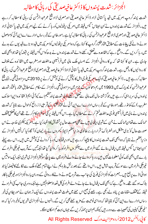 Shidat Pasando Ka Doctor Afia Sadiqi Ki Rihai Ka Mutalba Aljzair