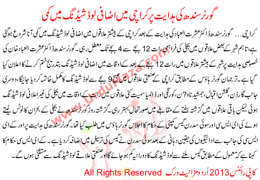 Governer Sindh Ki Hidayat Per Karachi Me Azafi Load Shading Me Kami
