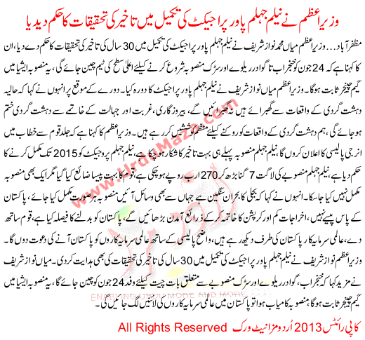 Prime Minsiter Orderd To Investigate Delay In Jhelam Project