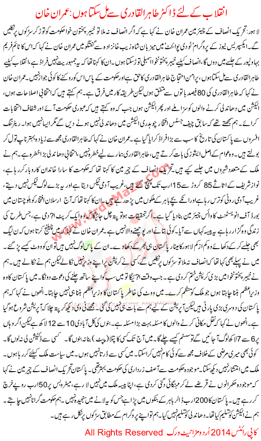 I Can Meet Tahir Ul Qadri For Revolution Imran Khan