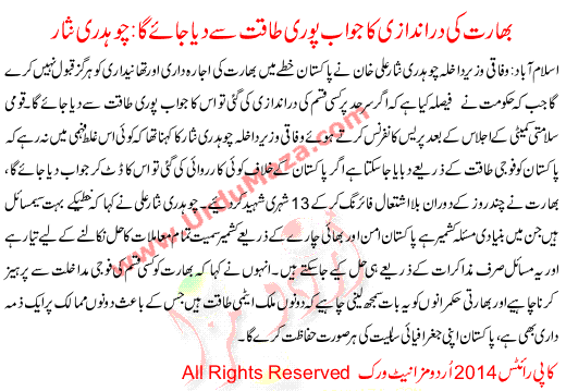Bharat Ki Darandazi Ka Jawab Pori Taqat Se Dya Jaye Ga Ch Nisar