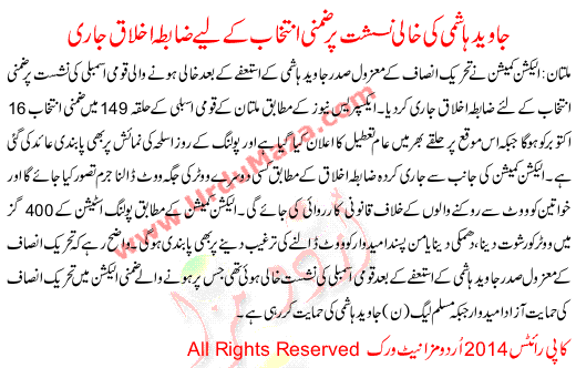 Code Of Conduct For Election In Emepty Seat Of Jawed Hashmi