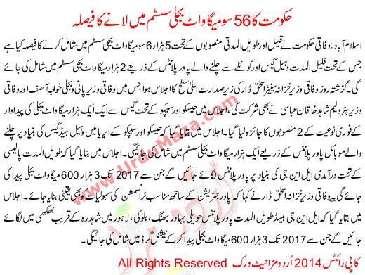Government Decided To Bring 56 Hundrad Megawatt Electricity In System