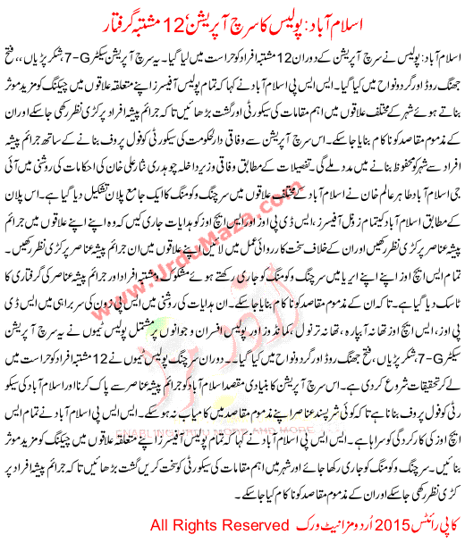 Islamabad Police Arrest 12 Suspected In Search Operation