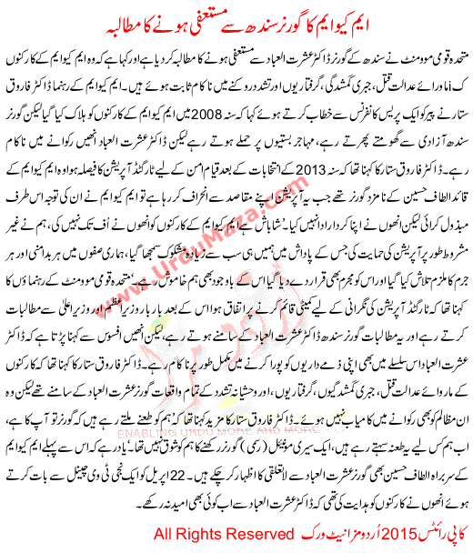 Mqm Demanded To Should Resgin Of Governor Sindh