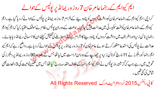 Mqm Leader Amir Khan 7-day Handed To Police For Remand