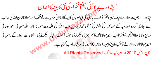 Pishawar Jui Ki Nai Kabeena Ka Ilan