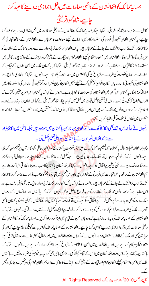 Hamsaya Mumalik Ko Afghanistan K Mamlaat Ma Dakhalandazi Na Krnay Ka Ohad Dena Chahiay