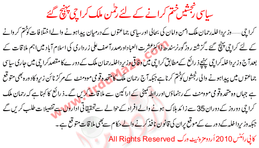 Sayasi Ranjishain Khatam Karany K Liay Rehman Malik Karachi Pohnch Gaye