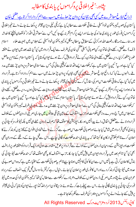 Peshawar Gher Ikhlaqi Programo Per Pabandi Ka Mutalba