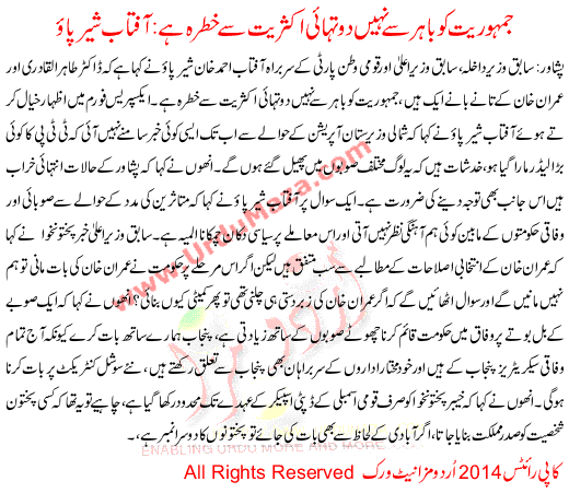 Jamhoriat Ko Bahir Se Nahi Two Third Majority Se Khatra Hai Aftab Sher Pao