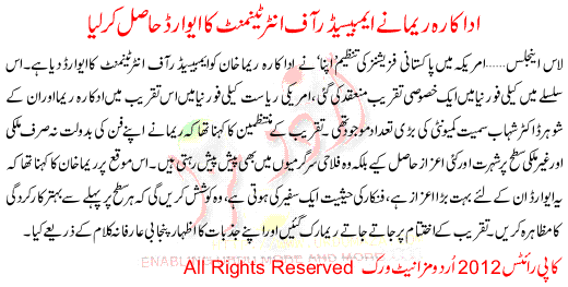 Adakara Reema Na Embesider Of Entertainment Ka Award Hasil Kr Liya