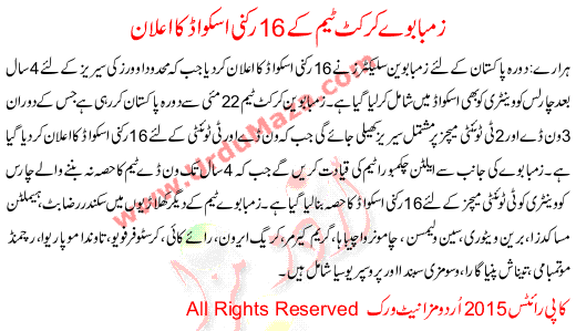 Zimbabwe Cricket Team Announced 16 Man Squad