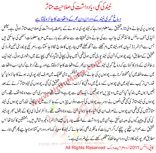 Neend Ki Kami Yaddasht Ki Salahiat Mutasir