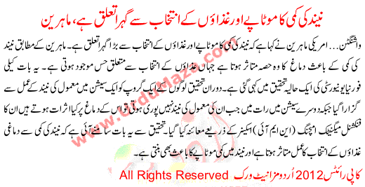 Neend Ki Kami Ka Motape Or Ghazao K Intikhab Se Gehra Taluq Hai