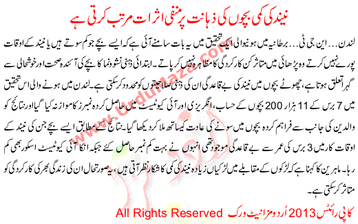 Neend Ki Kami Bacho Ki Zehanat Per Manfi Asrat Muratab Krti Hai