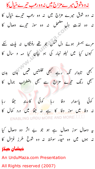 Na Wo Shoq Mere Mazaj Main Na Wo Ruab Tere Khial Ka