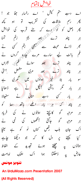 'Khawahishe Na Tamam' Poetry by Tanvir Mounus