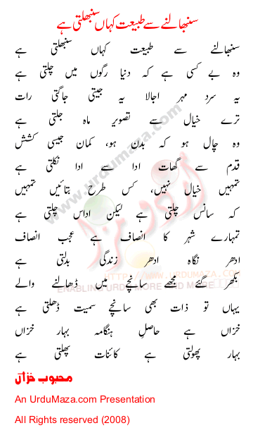 'Sanbhalnay Say Tabiat' Poetry by Mehboob Khizan