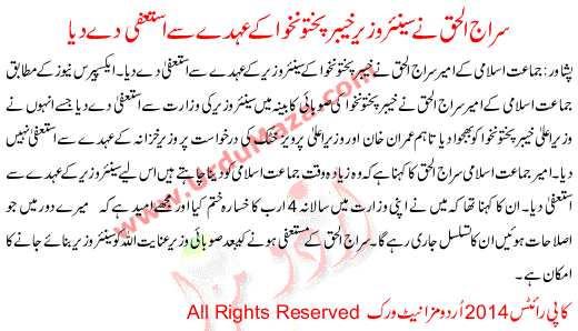 Siraj-ul-haq Resigned From The Post Of Senior Minister Of Kpk