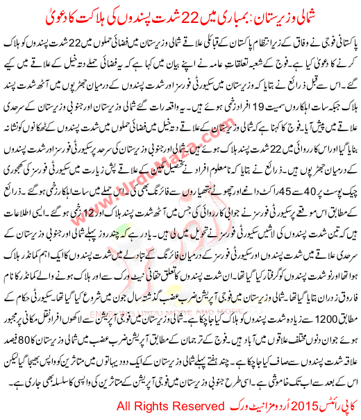Bombed Attack Killed 22 Militants Claim In North Waziristan