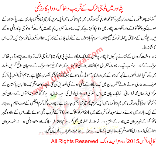 Blast In Peshawar Near Army Vihicle 2 Injured