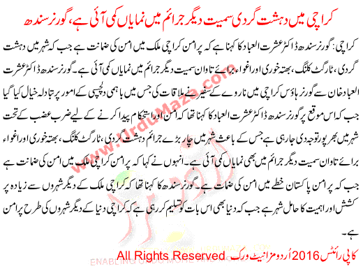 Karachi Significant Reduction In Other Crimes, Including Terrorism Governer Sindh