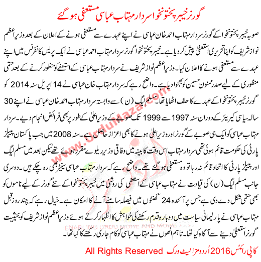 Governor Khyber Pakhtunkhwa Sardar Mehtab Abbasi Have Resigned