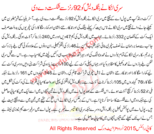 Sri Lanka Beat Bangla Desh By 92 Runs
