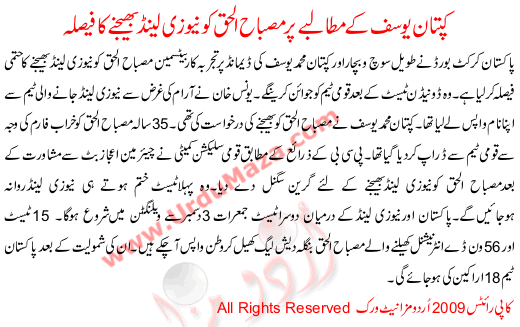 Captain Yousuf K Mutalbay Pr Misbah Ko Newzealad Bhejnay Ka Fesla